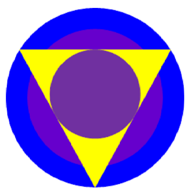 Il était évident que l’Anneau de Radiation correspondait au Cercle de Triangulature et non pas au Cercle ex-inscrit, mais il lui était aussi évident que le Cercle de Triangulature délimitait un Espace Sacré (violet + indigo) auquel aucun d’entre eux ne pouvait avoir accès. Il était donc vital qu’aucun d’entre eux ne tente de pénétrer cet Espace Sacré, qui, en supposant que ce fût possible, serait ainsi aussitôt profané, rendant la Liaison de Lumière impossible.