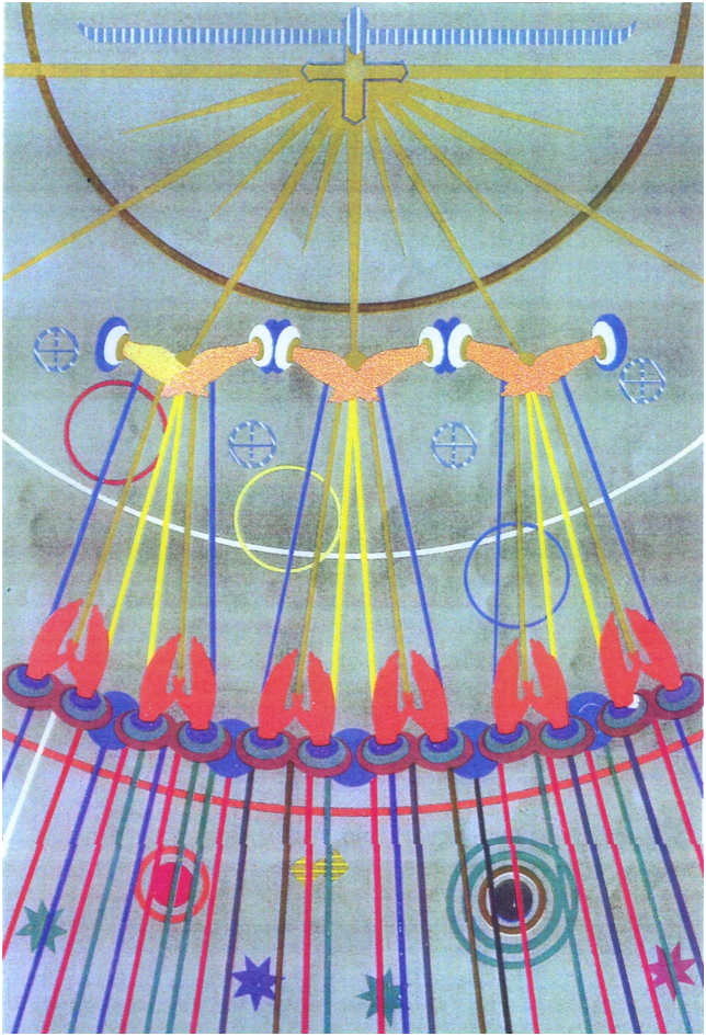 Esther sortit alors une image de sa poche (elle l’avait reçu pendant la nuit, puis dessinée) et de sa place la leur montra à tous. Elle représentait des rayons qui partaient de très, très haut, depuis la Création Originelle et même au-dessus, puis étaient transmis de plan en plan par des mains.